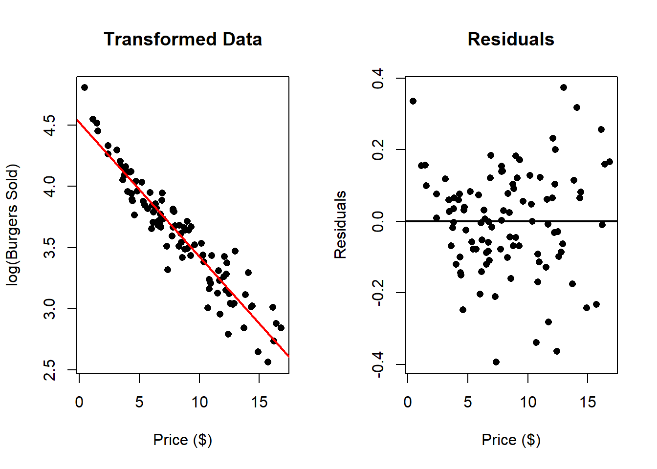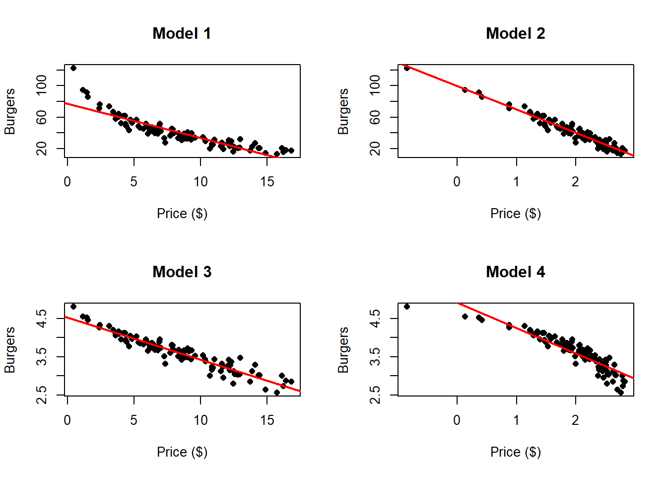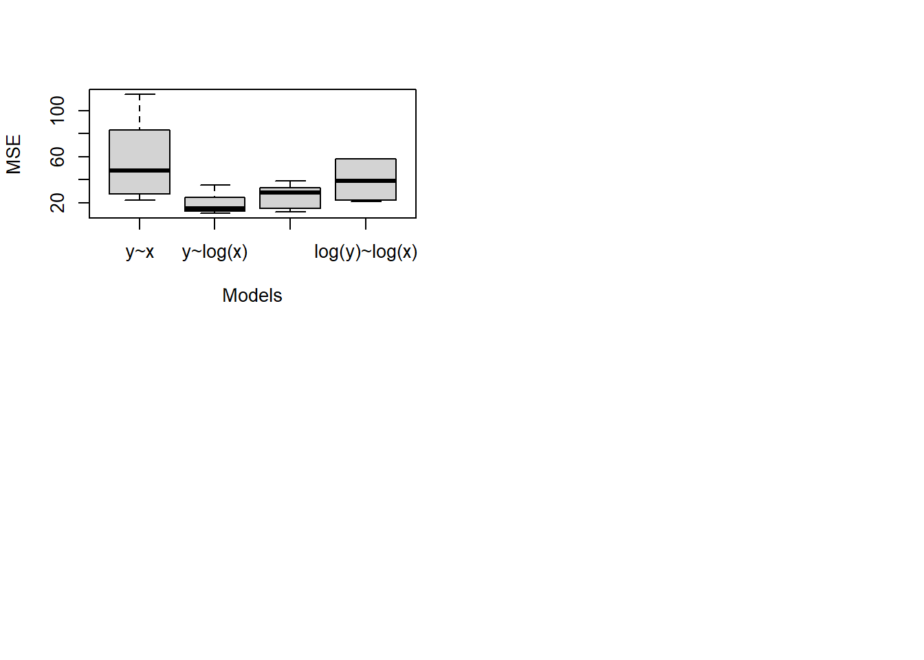 axis(side = 1, at = c(1, 2, 3, 4), labels = c("y~x", "y~log(x)", "log(y)~x", "log(y)~log(x)"))