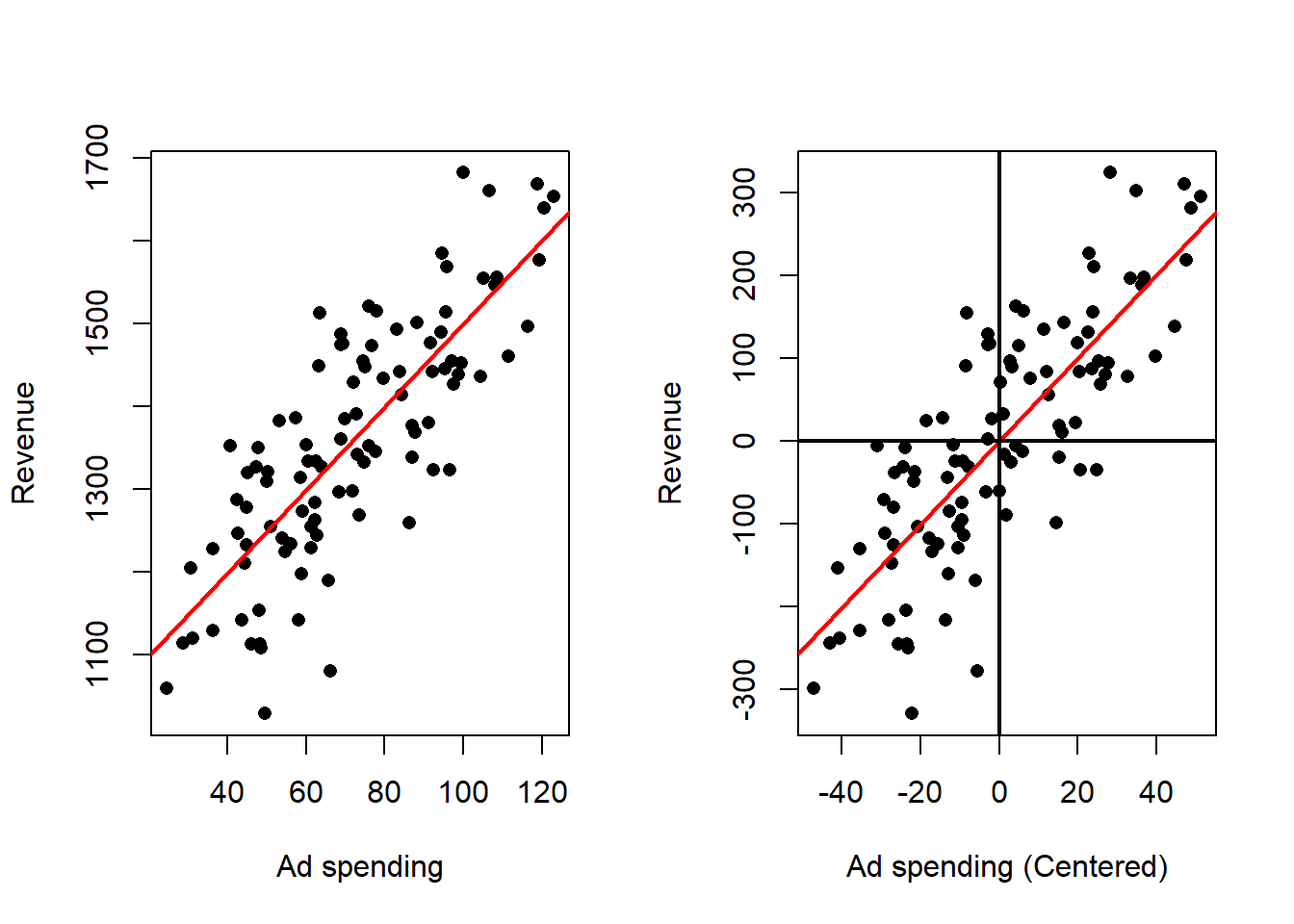 Now, notice that: \[\begin{align*} \bar{y} \sum_{i=1}^n x_i^2 - \bar{x} \sum_{i=1}^n x_i y_i &= \bar{y} \sum_{i=1}^n x_i^2 -n \bar{y}\bar{x}^2 + n \bar{y}\bar{x}^2 - \bar{x} \sum_{i=1}^n x_i y_i & \text{adding 0} \\ &= \bar{y} \left(\sum_{i=1}^n x_i^2 -n \bar{x}^2 \right) + \bar{x}\left(n \bar{y}\bar{x} - \sum_{i=1}^n x_i y_i \right) & \\ &= \bar{y} (n-1)S_{xx} - \bar{x}(n-1)S_{yx} & S{xx}=\frac{\sum_{i=1}^n x_i^2 - n \left( \bar{x} \right)^2}{n-1}, S{xy}=\frac{\sum_{i=1}^n x_iy_i - n \bar{x}\bar{y}}{n-1} \\ &= (n-1)\left(\bar{y} S_{xx} - S_{yx} \bar{x} \right) & S{xx}=\frac{\sum_{i=1}^n x_i^2 - n \left( \bar{x} \right)^2}{n-1}, S{xy}=\frac{\sum_{i=1}^n x_iy_i - n \bar{x}\bar{y}}{n-1} \\ \end{align*}\] Then we have that: \[\begin{align*} \hat{\boldsymbol{\beta}} &= \frac{1}{n(n-1)S_{xx}} \begin{bmatrix} n (n-1)\left(\bar{y} S_{xx} - S_{yx} \bar{x} \right) \\ n (n-1) S{xy} \end{bmatrix} & \\ &= \begin{bmatrix} \frac{n (n-1)\left(\bar{y} S_{xx} - S_{yx} \bar{x} \right)}{n(n-1)S_{xx}} \\ \frac{n (n-1) S{xy}}{n(n-1)S_{xx}} \end{bmatrix} & \\ &= \begin{bmatrix} \frac{\left(\bar{y} S_{xx} - S_{yx} \bar{x} \right)}{S_{xx}} \\ \frac{S{xy}}{S_{xx}} \end{bmatrix} & \\ &= \begin{bmatrix} \frac{\bar{y} S_{xx}}{S_{xx}} - \frac{S_{yx} \bar{x}}{S_{xx}} \\ \hat{\beta}_1 \end{bmatrix} & \hat{\beta}_1 = \frac{S{xy}}{S_{xx}}\\ &= \begin{bmatrix} \bar{y} - \bar{x}\frac{S_{yx}}{S_{xx}} \\ \hat{\beta}_1 \end{bmatrix} & \\ &= \begin{bmatrix} \bar{y} - \bar{x}\hat{\beta}_1 \\ \hat{\beta}_1 \end{bmatrix} & \hat{\beta}_1 = \frac{S{xy}}{S_{xx}}\\ \end{align*}\]
