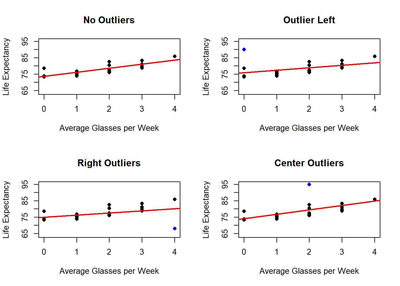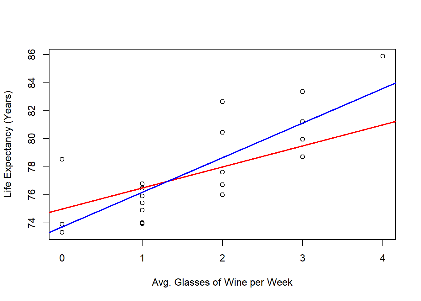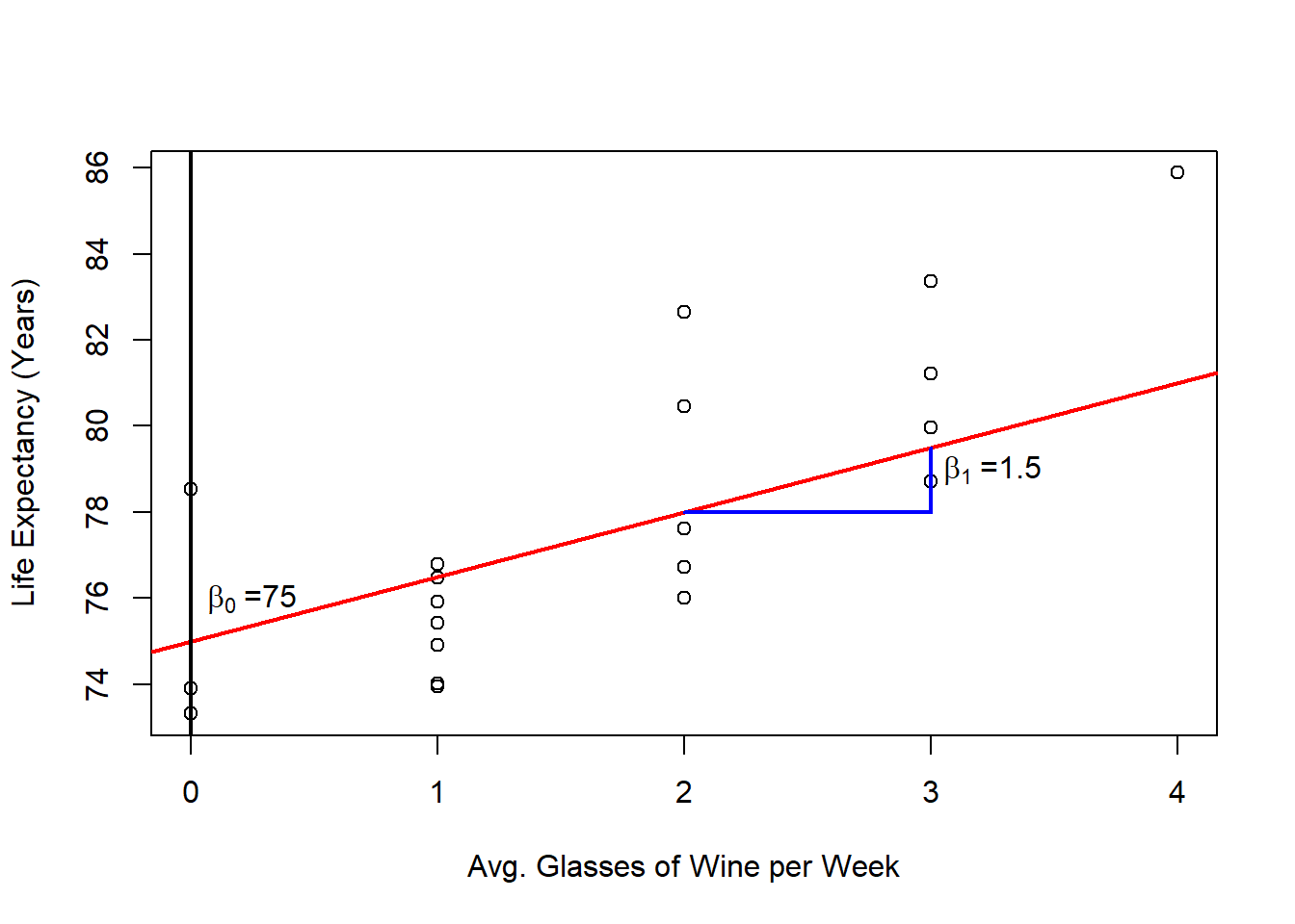 In this case, the intercept \(\beta_0\) is meaningful, as it represents the expected number of years a person would live if they didn’t drink wine at all. However, depending on the data, the intercept may or may not have a meaningful interpretation. The slope \(\beta_1\) indicates that for each additional glass of wine consumed per week, our model predicts an increase of 1.5 years in life expectancy.
