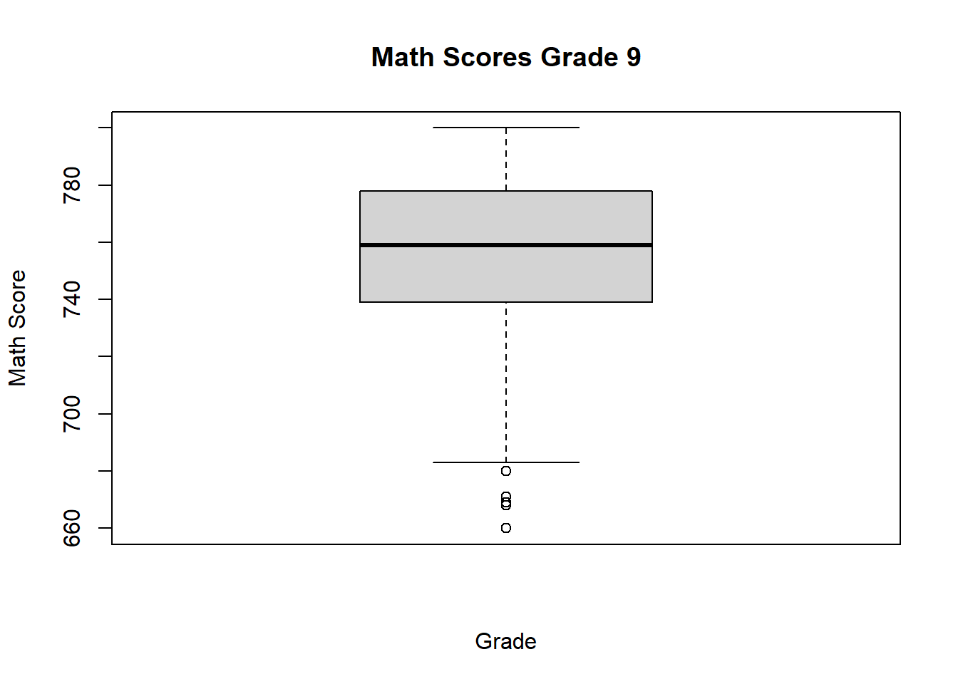 The display allows us to compare distributions across grades while also identifying possible outliers in each group. If any points appear beyond the whiskers, those observations are flagged as unusual relative to the rest of the scores for that grade.