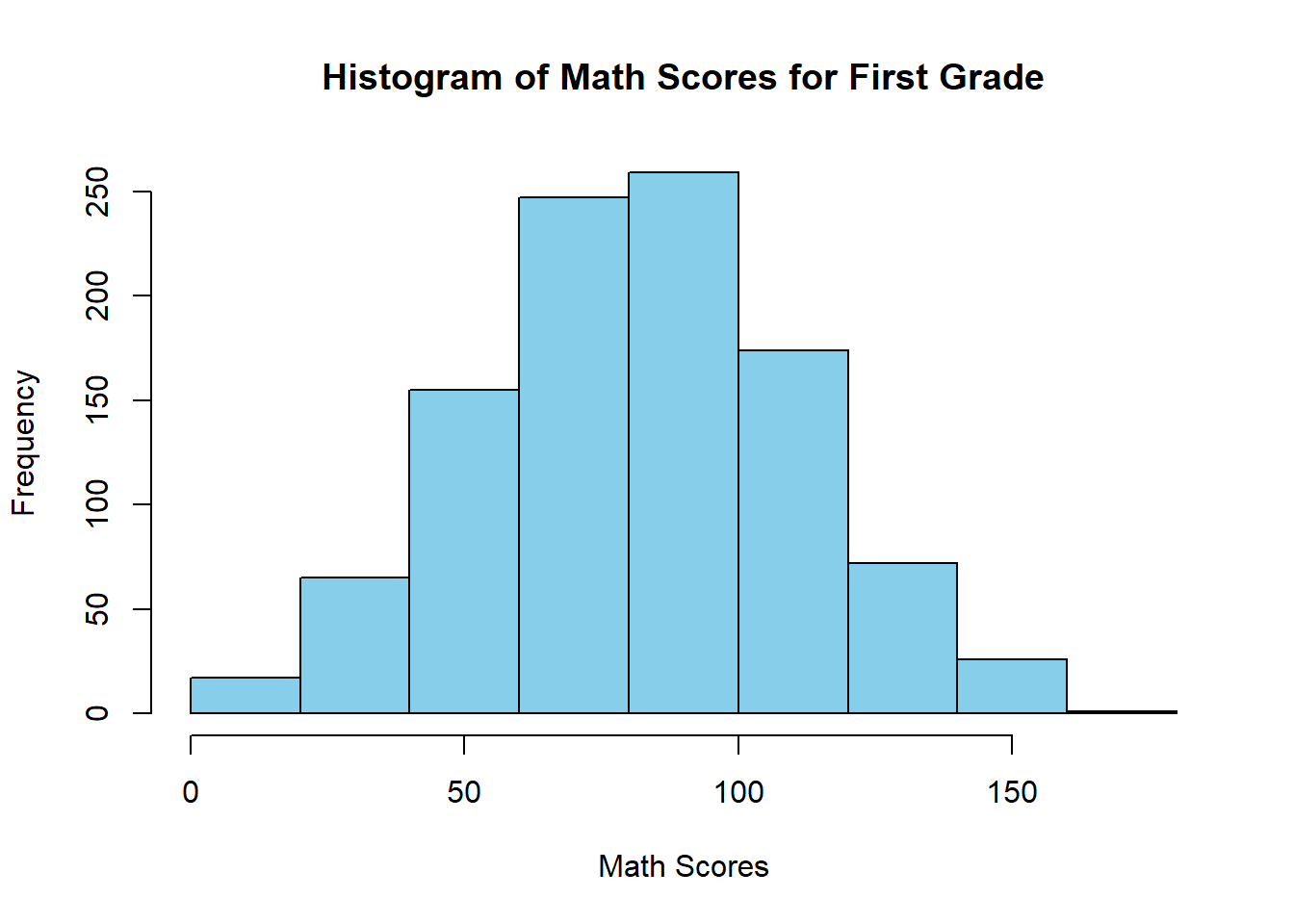 print(paste0("The interquartile range of Math scores for first graders is: ",qua[2] - qua[1]))## [1] "The interquartile range of Math scores for first graders is: 40"