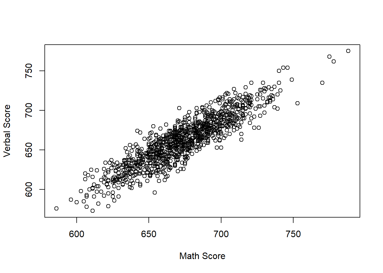 plot(schDat$Math_Score[schDat$Grade == 8], schDat$Verbal_Score[schDat$Grade == 8], xlab = "Math Score", ylab = "Verbal Score")