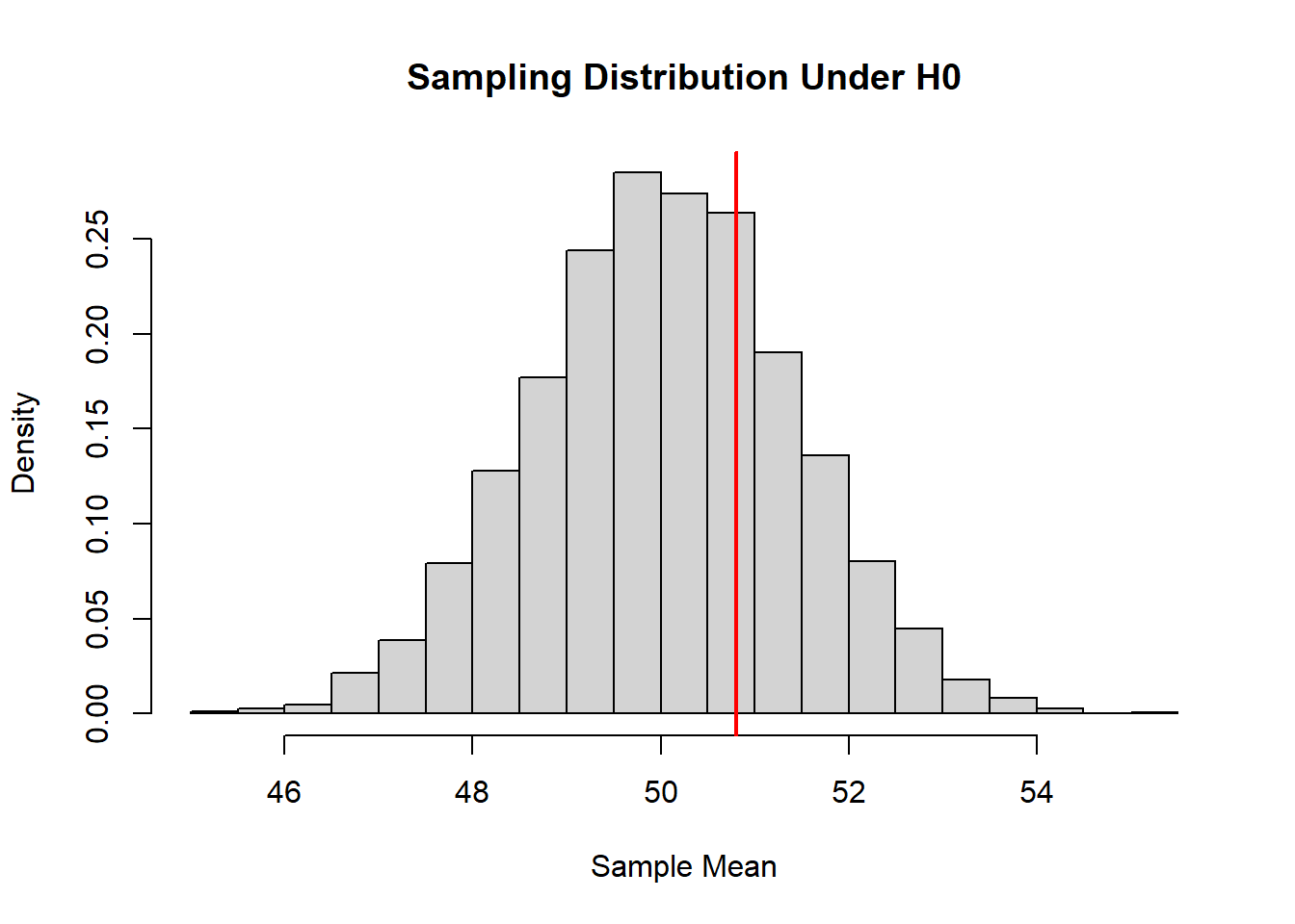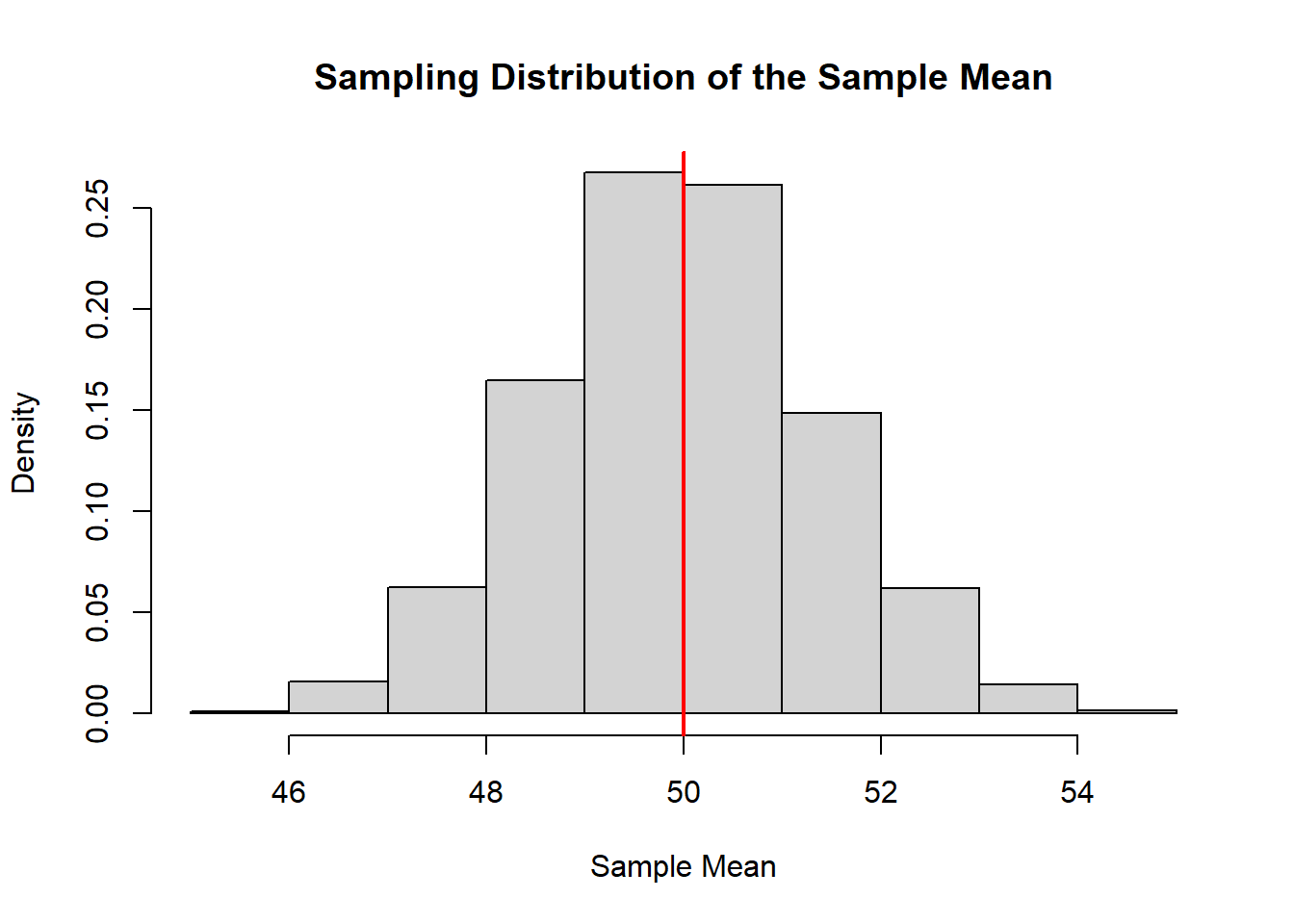 The histogram shows the sampling distribution of the sample mean. The red line indicates the true population mean.