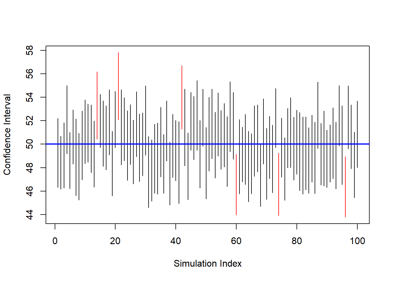 Each vertical segment is a confidence interval. Intervals that fail to contain μ are shown in red.